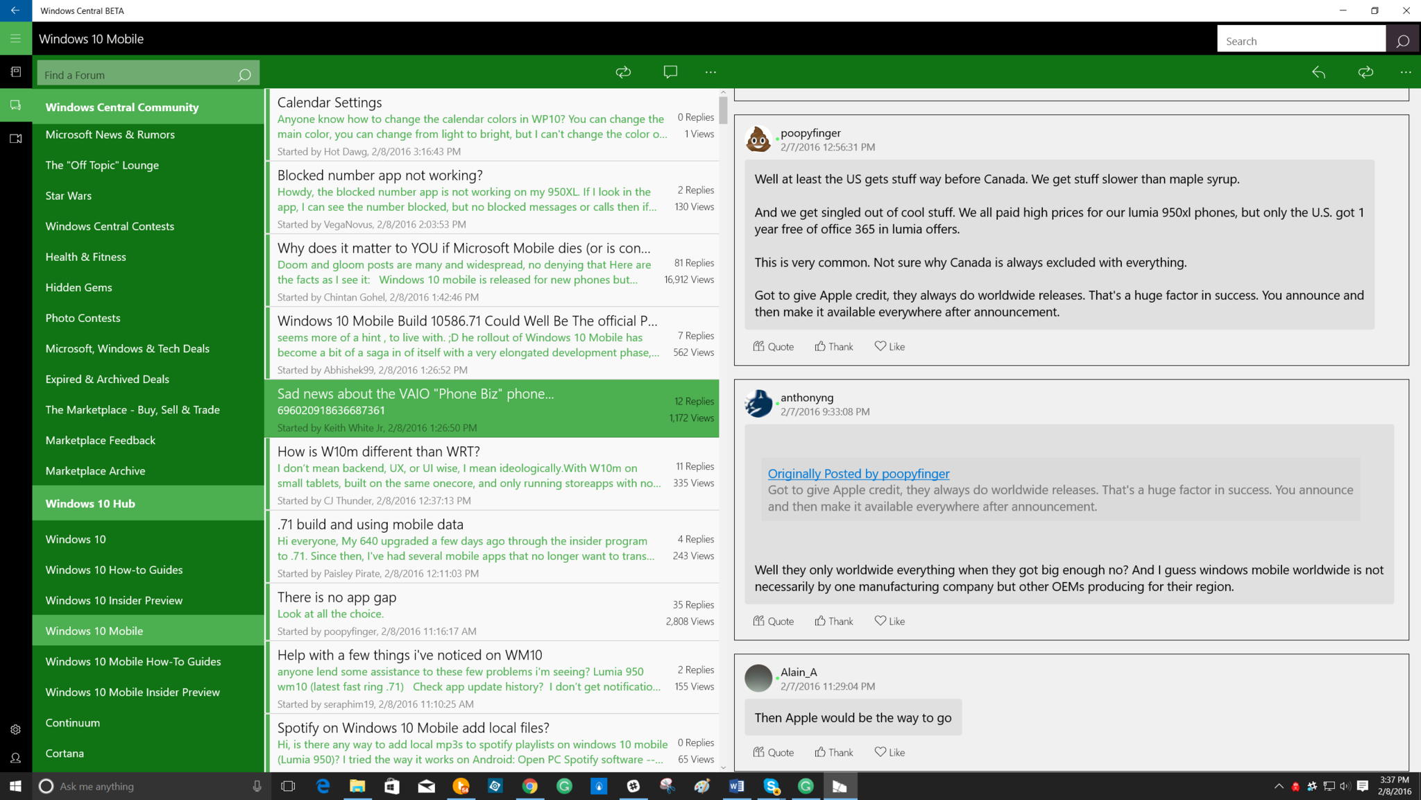 There are the usual roadblocks and items that took longer than expected. The holidays also didn't help besides waiting for Windows 10 Mobile to stabilize. For instance, forum integration is a huge project in and of itself. Being able to Quote and Thank a post as well as create one and log in to your account are not at all trivial.