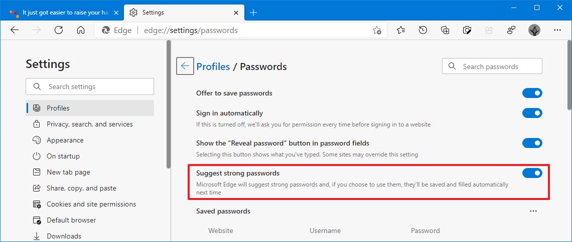 On Windows 10, the default web browser also includes a password generator that can suggest strong passwords when setting up an online account for an online service or when you have to update an account. If you choose to use the sugestion, the browser will save and sync the information across your devices.