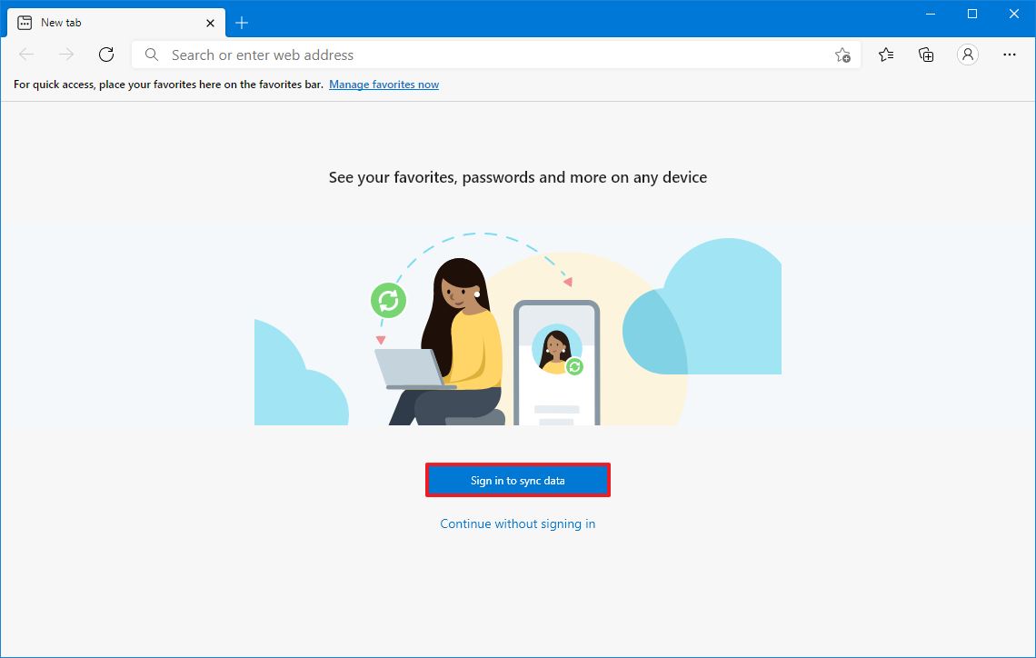 - (Optional) Click the Sign in to sync data button.Quick tip: If you do not want to sync your settings, click the Continue without signing in in option. You can always enable syncing from the profile settings page.