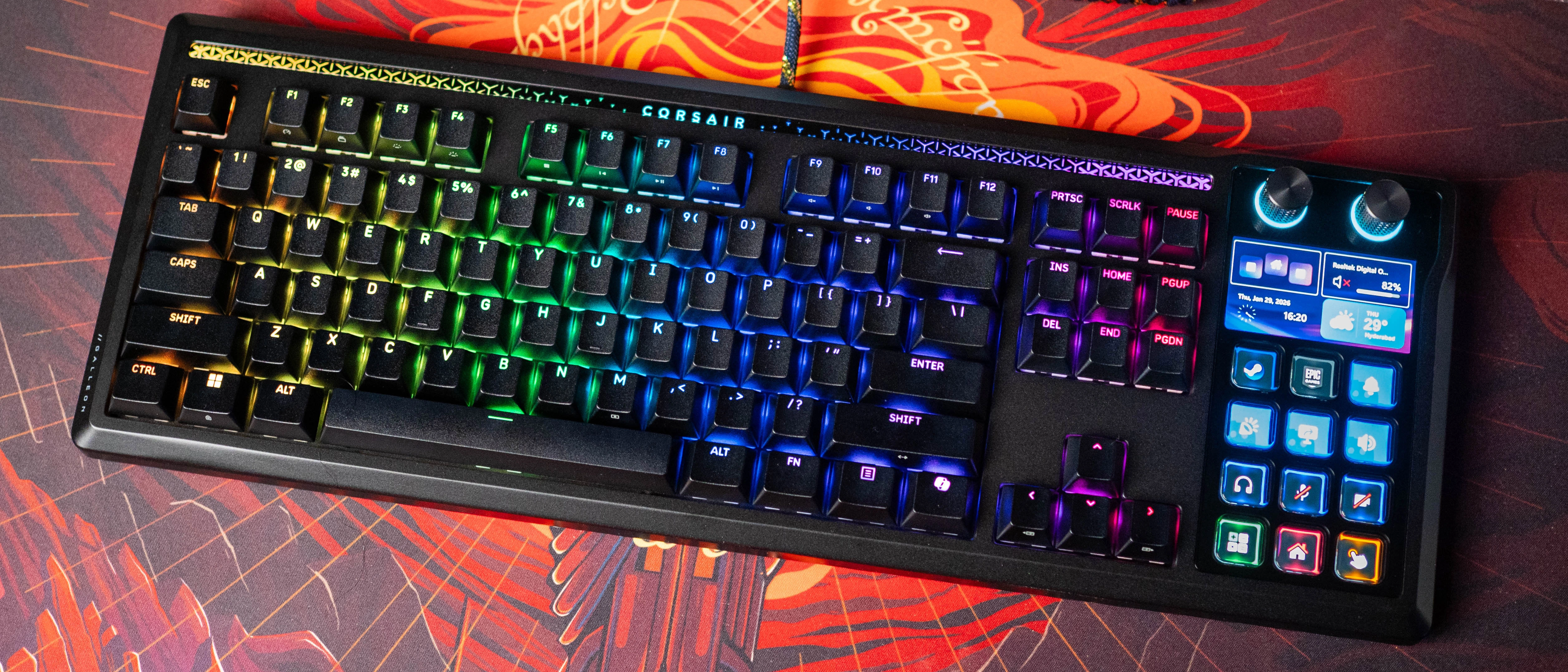 The ANSI version of the Galleon 100 gets the standard 87 keys, with a 5-inch panel on the right that doubles as a Stream Deck. It's a pretty cool idea to integrate the control center into the keyboard, and the Galleon 100 isn't any bigger than regular full-size boards.