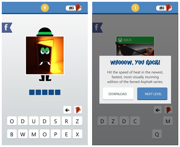 As you correctly identify the icon, a congratulatory message will appear with options to advance to the next level or visit the Windows Phone Store to download the app or game. Additionally with each correct identification, you will earn gems that can be used to purchase cheats when you are stuck on an icon.