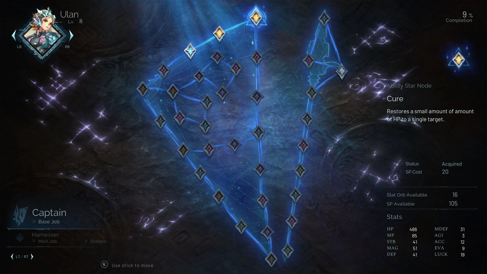 Overcomplication is a theme for Astria Ascending as even the game's skill tree systems revolve around each of the eight characters taking on four different "jobs." For each unlocked job slot players can choose one of three combat styles. Each combat style offers a corresponding skill tree that provides an avenue for equipping your character with different magic spells, weaponry, and other useful items. Eight demigods with four job slots each containing three potential jobs equals way too many skill trees.