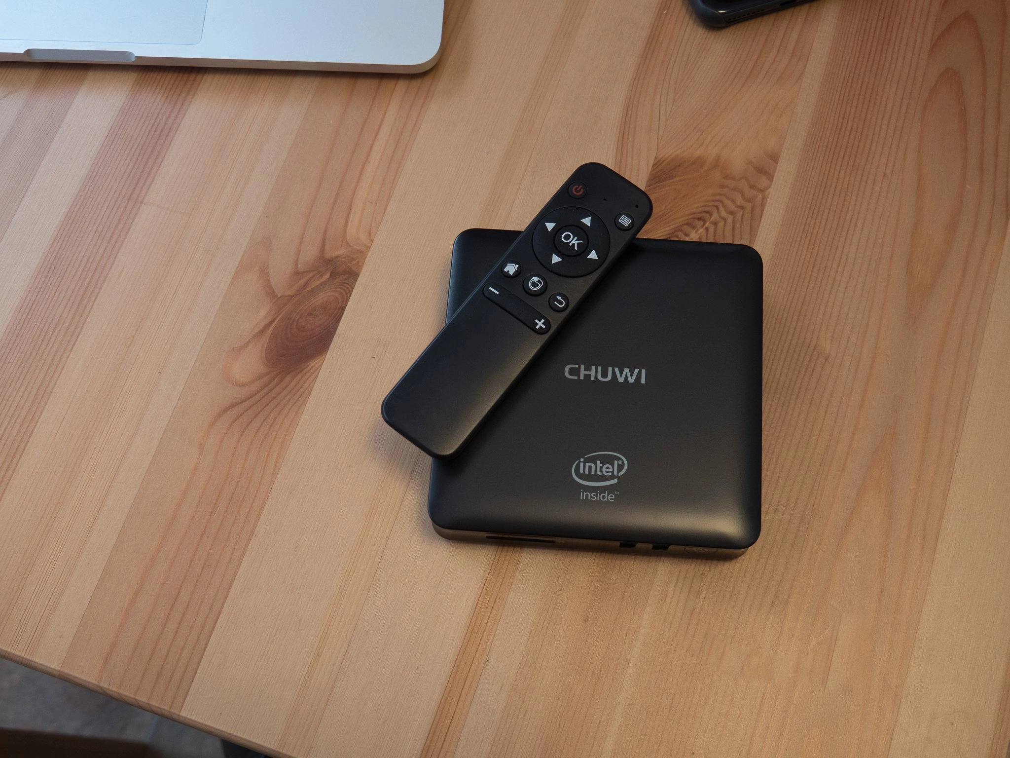 The HiBox comes with a AA-powered remote control (BYOBatteries) if you don't have a real keyboard and mouse. The remote serves as a bad wave-in-the-air pointer thing, so you can look like an idiot while badly controlling things in Windows or Android