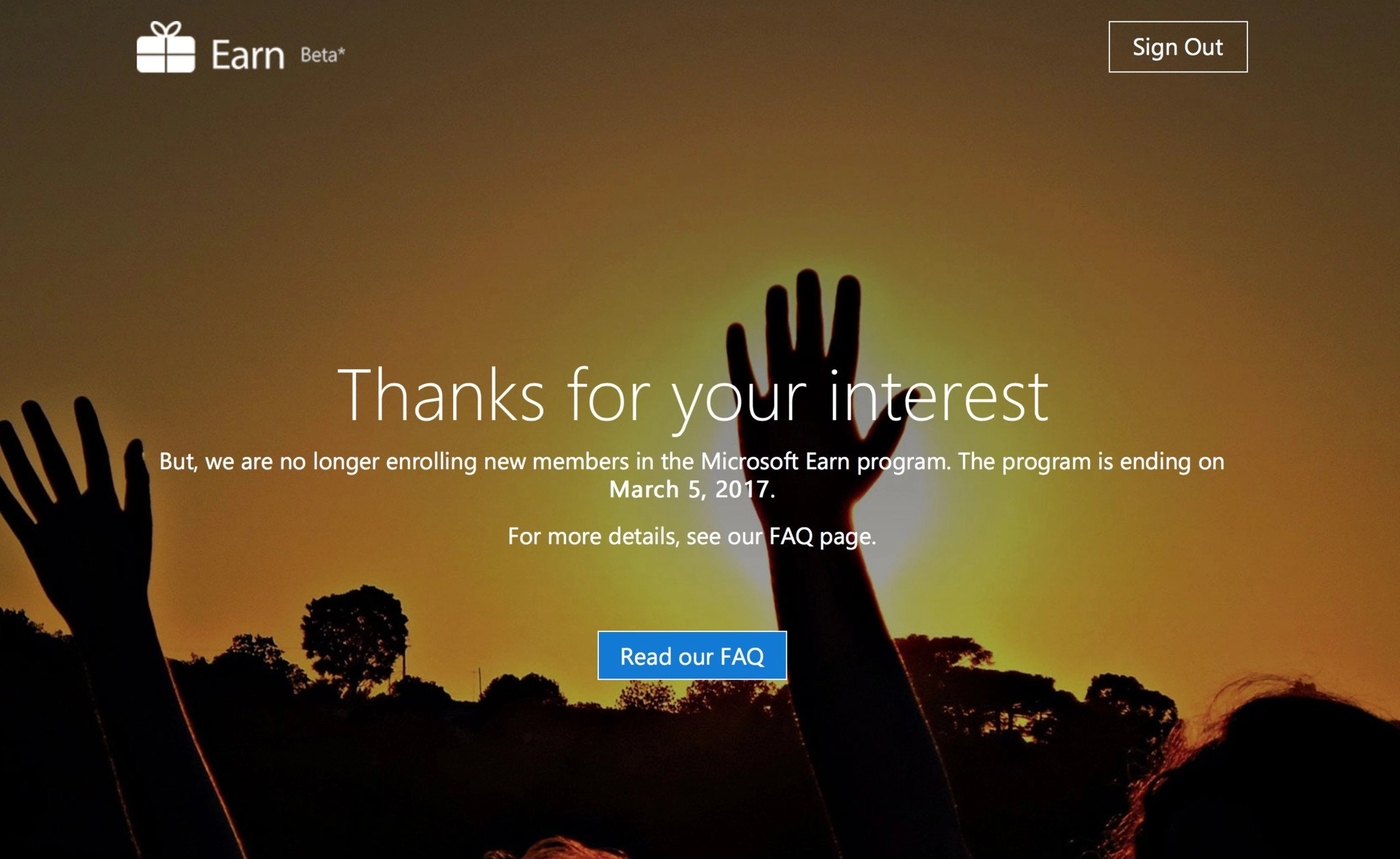 The Microsoft Earn program is ending on March 5, 2017. We want to thank you for being an Earn member, and we hope the program has been beneficial to you.Between now and March, you can spend your Earn credits, as usual, in the Microsoft store (online and in-store).
