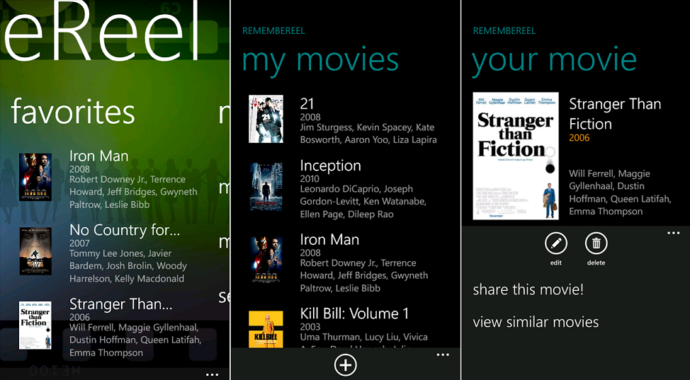 remembeReel simply allows you to type in the movie you're watching (or watched), it checks it against Rotten Tomatoes (site) and pulls down the info for you. With one tap, you save it to your list. A few more taps and you can add it to your 'favorites', add notes, punch in the date and share it via Twitter, Facebook, Live, etc. Not only can you share it but it'll provide the URL for the listing on Rotten Tomatoes so others can quickly read-up on what you've just watched. Brilliant. You can also sort by title or date-viewed which is convenient.