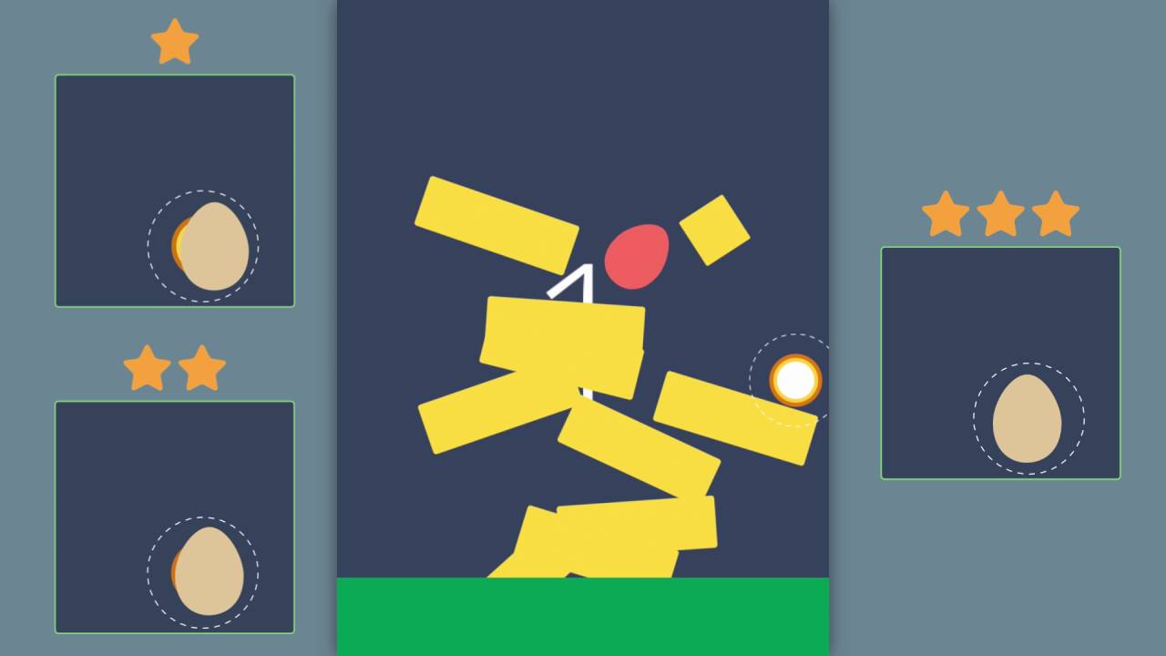 The game screen has the egg suspended at the top of the screen with an assortment of bricks, blocks and other items the egg bounces off of as it drops. Once you have evaluated a puzzle level, simply tap the screen where you believe the egg will stop. A target appears, the egg is released and all that is left is to wait.