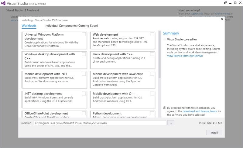 There are a couple of "workloads" that aren't present yet, including .NET Core tooling and Azure tooling, but the rest of the existing VS 2015 feature set is available.Apart from the new installer, Preview 4 also includes many other improvements. We have revamped the Start Page experience by adding new Open and Create features to the most frequently used Recent list and the News feed. And C++ has a whole lot of improvements across the board. We are also working on upgrading our feedback systems.
