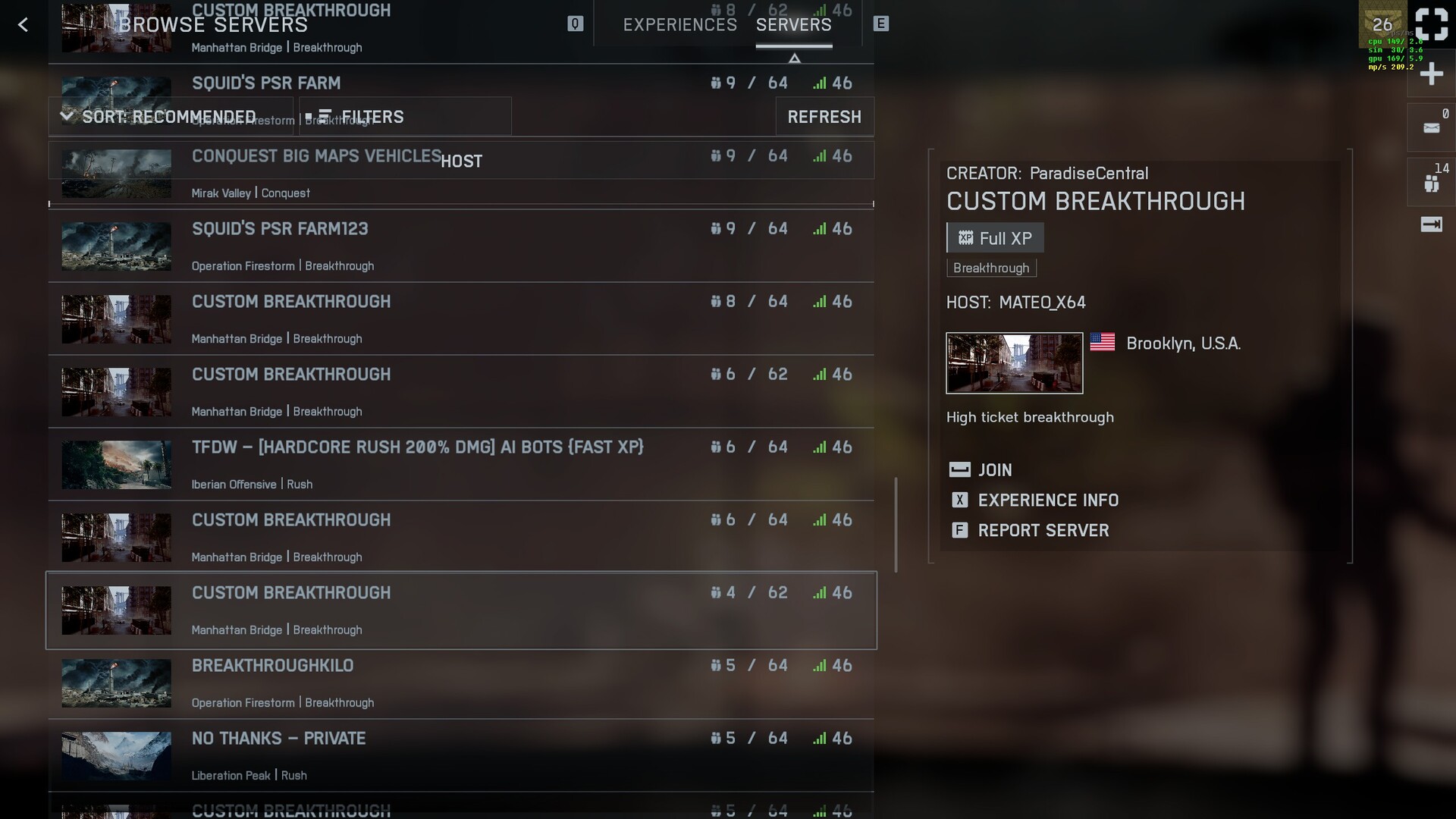 First, head into the server browser and look for maps under the name of "Rush". Filter the lobbies to games with 11+ slots available.