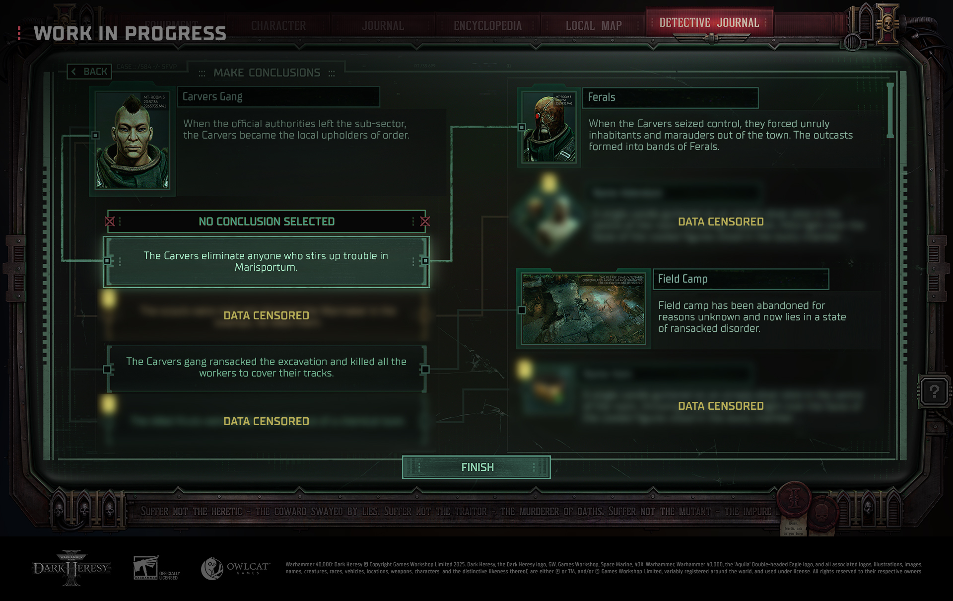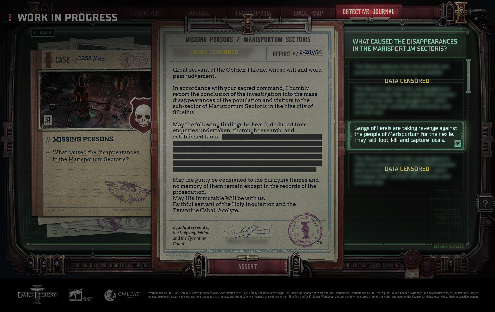 Here is a summary of Owlcat Games' deep dive into Warhammer 40,000: Dark Heresy Investigation system, as taken from the game's Steam news page.