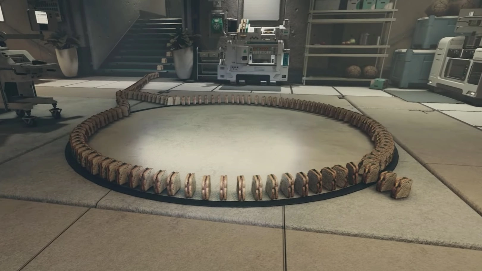 YouTuber Muaxh03, though, has gotten particularly creative. In a new video appropriately titled "When you know Bethesda game engine too well, you do stuff like this...," they showed off a set of dominos they set up in Starfield using books, milk cartons, a soccer ball, and...sandwiches. Lots of sandwiches.