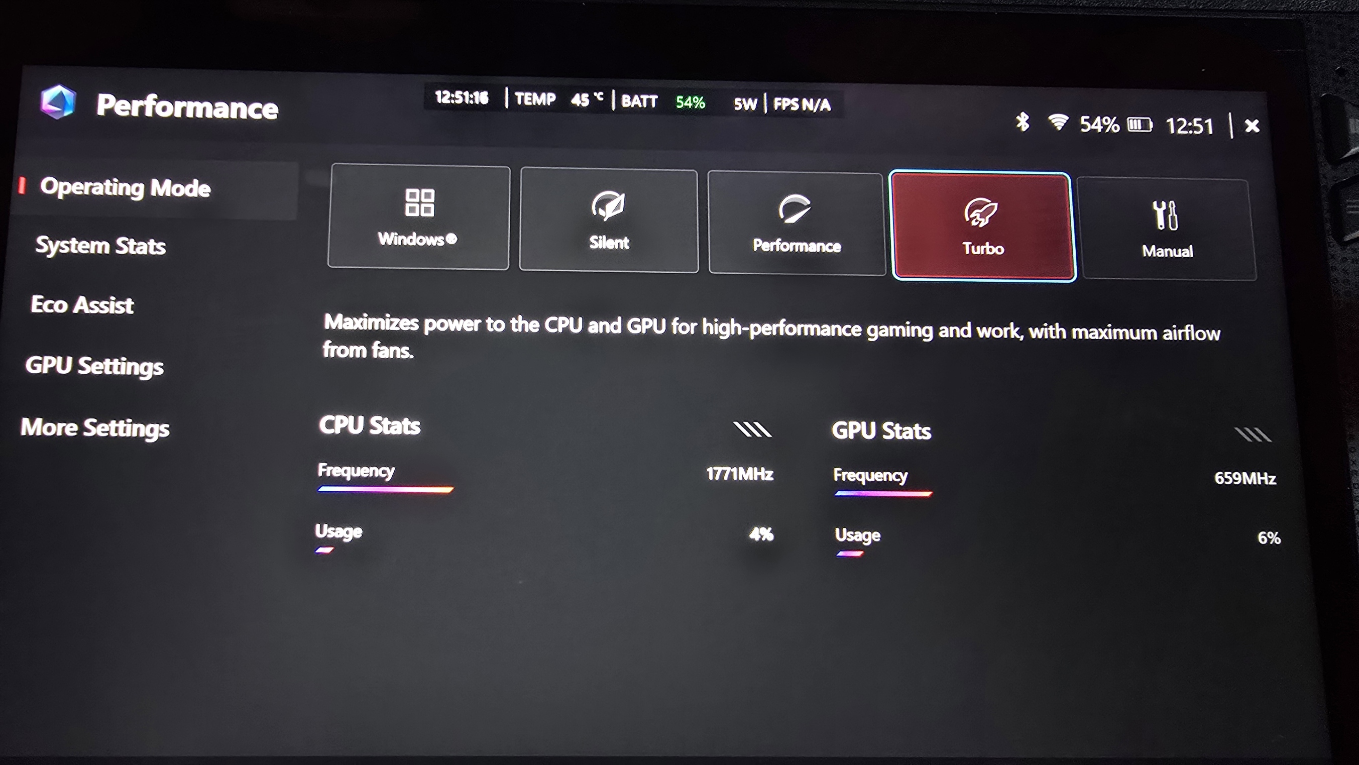 - To adjust the default power scaling modes, use your d-pad or joystick and hit A to choose between Silent, Performance, or Turbo modes.