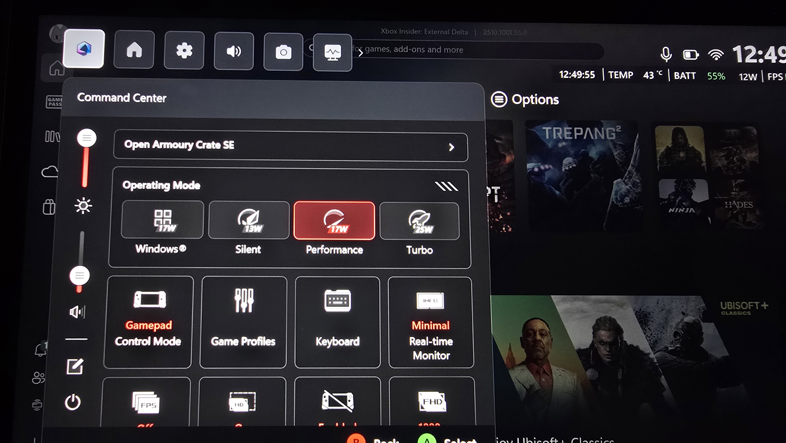 - There, by default, you should see the Armoury Crate Command Center, in a tab in the Xbox Guide. These are system-level settings provided by ASUS.