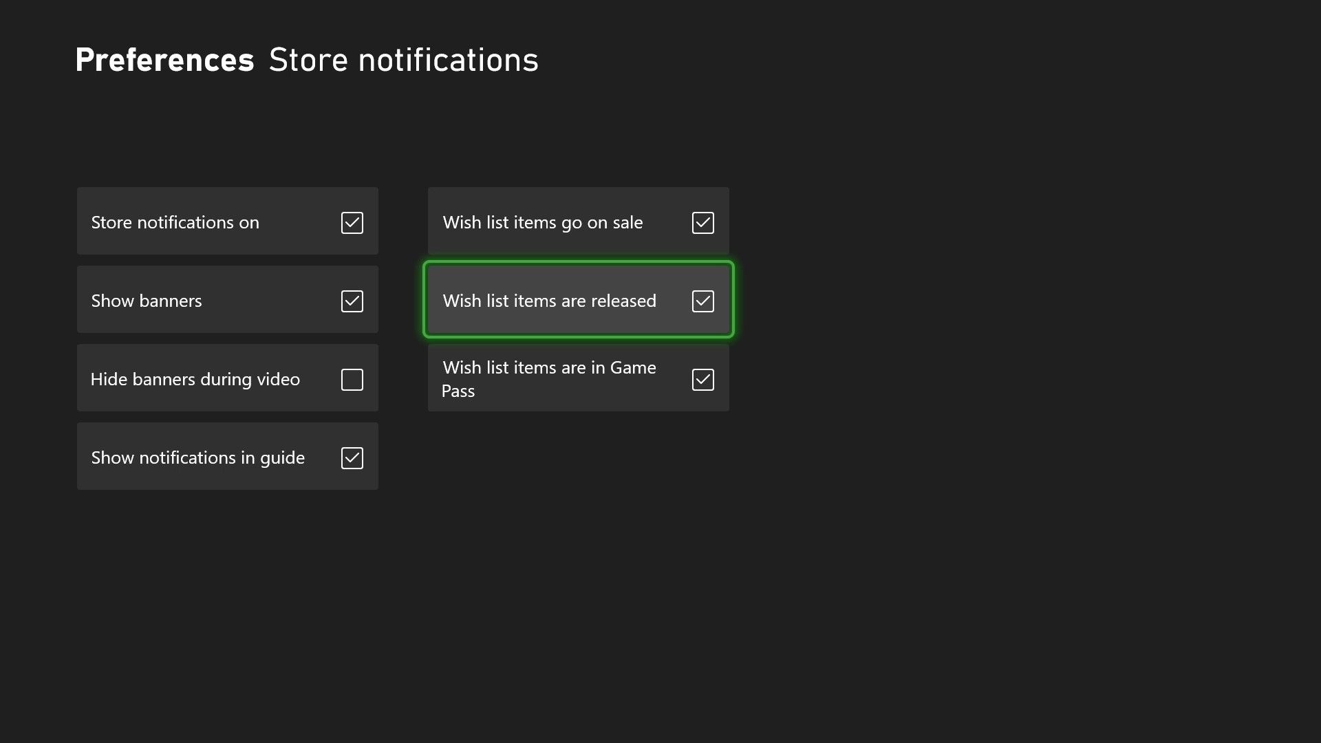 Speaking of the wish list, a new update there will give players more control over which updates they receive notifications for. Wish list notifications show up in the guide and as a pop-up, but you can choose to turn them off or lessen how often they show up by going to the preferences tab and selecting when you want to see them. The options include allowing a notification when an item on your wish list goes on sale, changes from pre-order to release, or joins the Xbox Game Pass lineup.