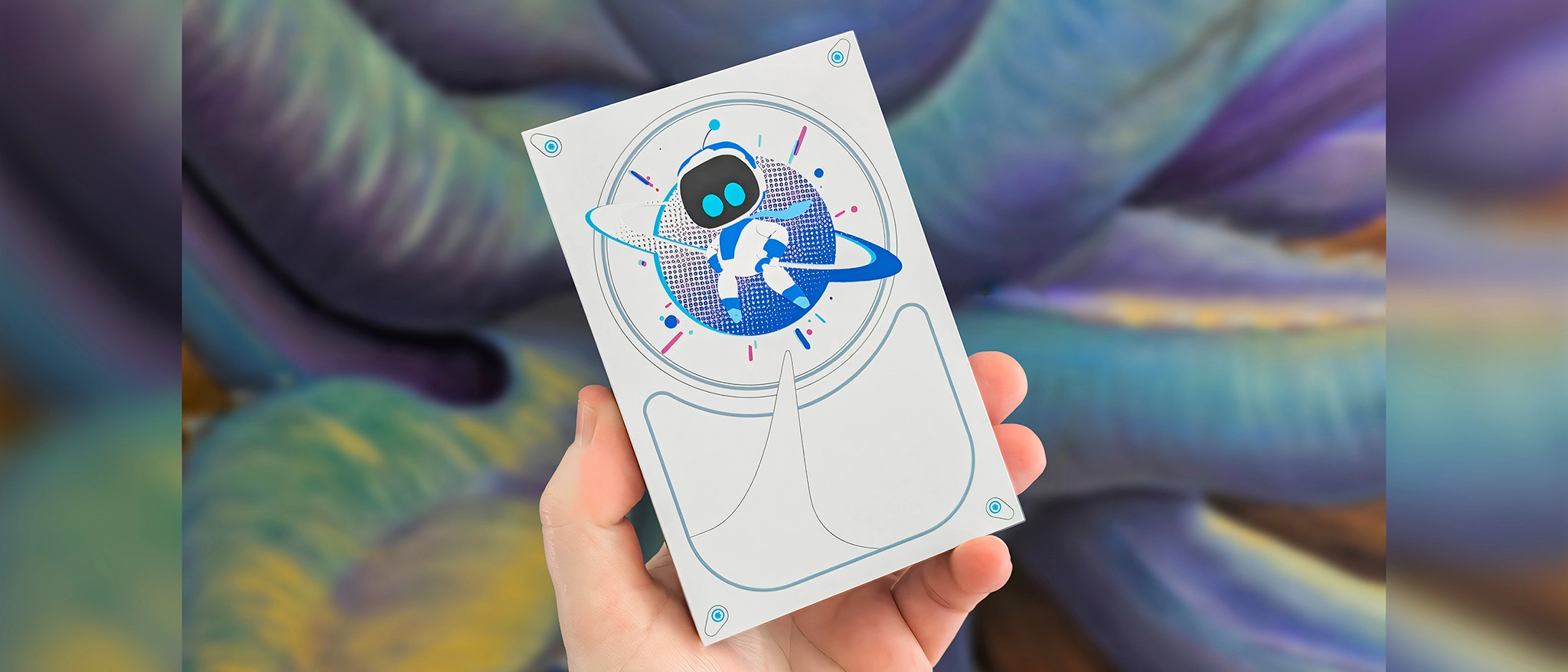 The front, back, and sides of the device showcase a theme that's very reminiscent of the game itself, complete with the titular Astro Bot standing with its hands on its hips in front of a planet. It all gives off a semi-Space Odyssey vibe, but with a cuter focus.