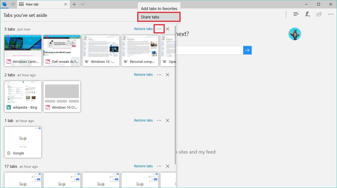 While you can quickly share a web link with other people using the share button located in the address bar, you can also share tabs you set aside using the new Share experience on Windows 10.