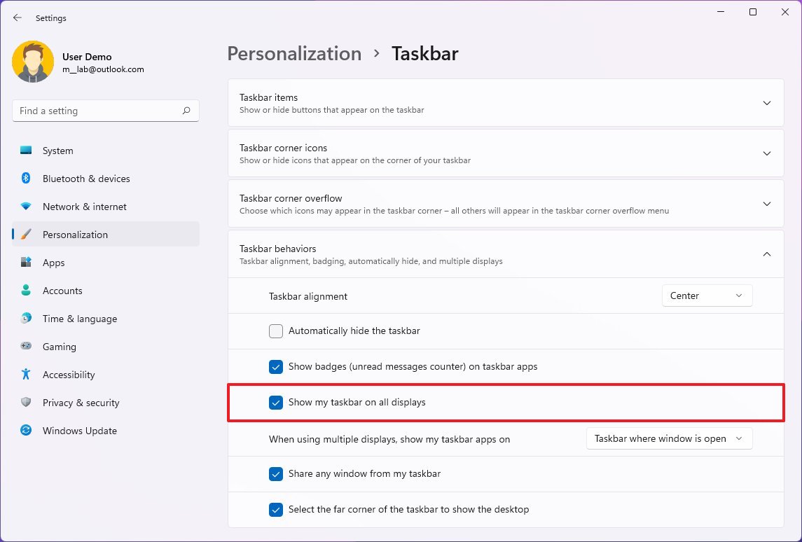 On a multi-monitor setup, the taskbar by default will appear only in the main display, but you can change the settings to show it across all the displays using these steps: