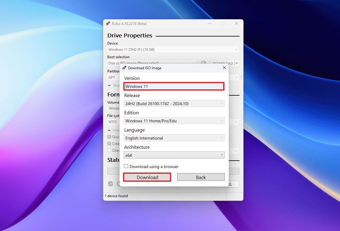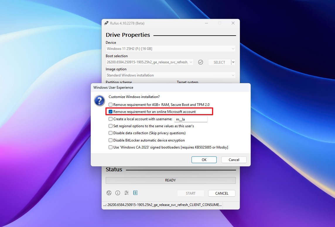 To modify the Windows 11 setup to skip the Microsoft account automatically using Rufus, use these steps: