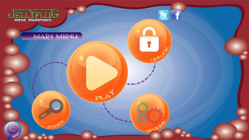 The main menu for Jellyflug Micro Adventures offers the customary options to jump into game play, access the gaming options and view a codex of all the bacteria you will encounter (45 characters in all). You also have in-app purchase opportunities from the main menu to unlock various gaming features such as unlock all the levels, all the characters and remove ad-support.
