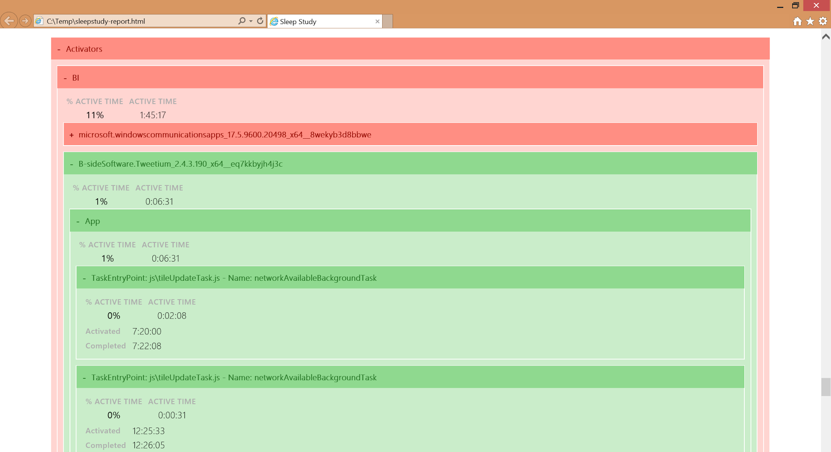 The final report is spit out into the temp directory as 'sleepstudy-report.html', meaning you can just open it in a web browser. The whole process took only seconds to generate. Everything from network information to software and hardware activity reveals itself in the report. It's even color-coded with green, yellow or red for activity level intensity.