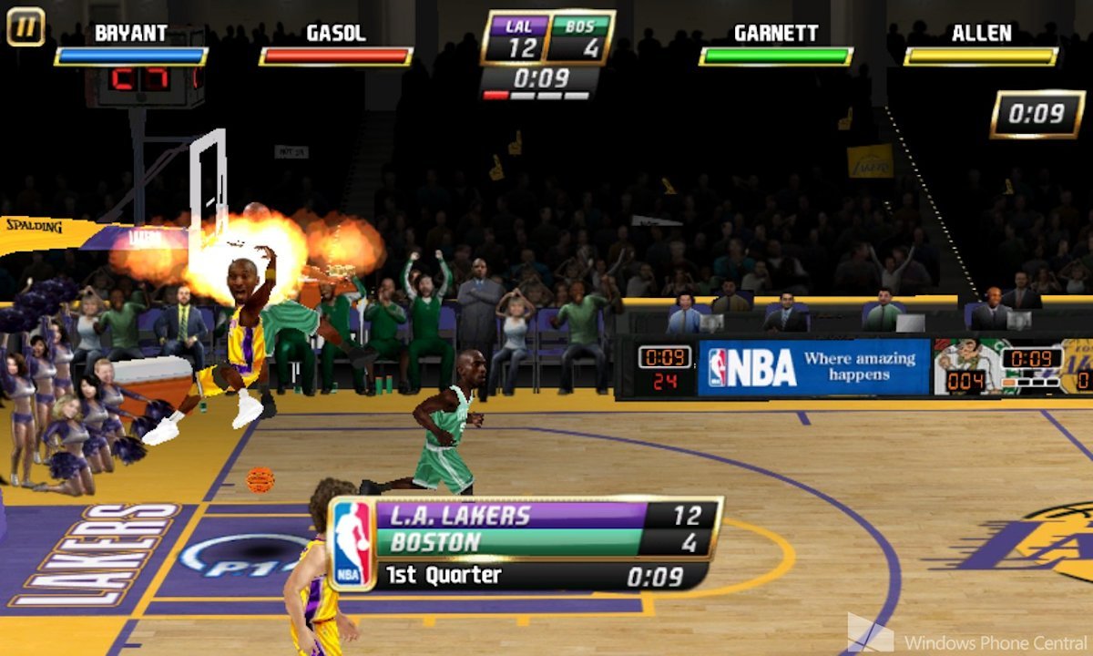 The Windows Phone version offers both virtual and swipe-based controls. I didn’t try swipes, but the virtual controls work like a charm. A virtual stick on the thumb controls running, while three buttons on the right represent shooting/blocking, stealing, and fire (a speed burst). Instead of having to hold two buttons at once to shoot while using fire, you just hit fire and then slide your thumb to the shoot button – a fine solution for touch screen gameplay.