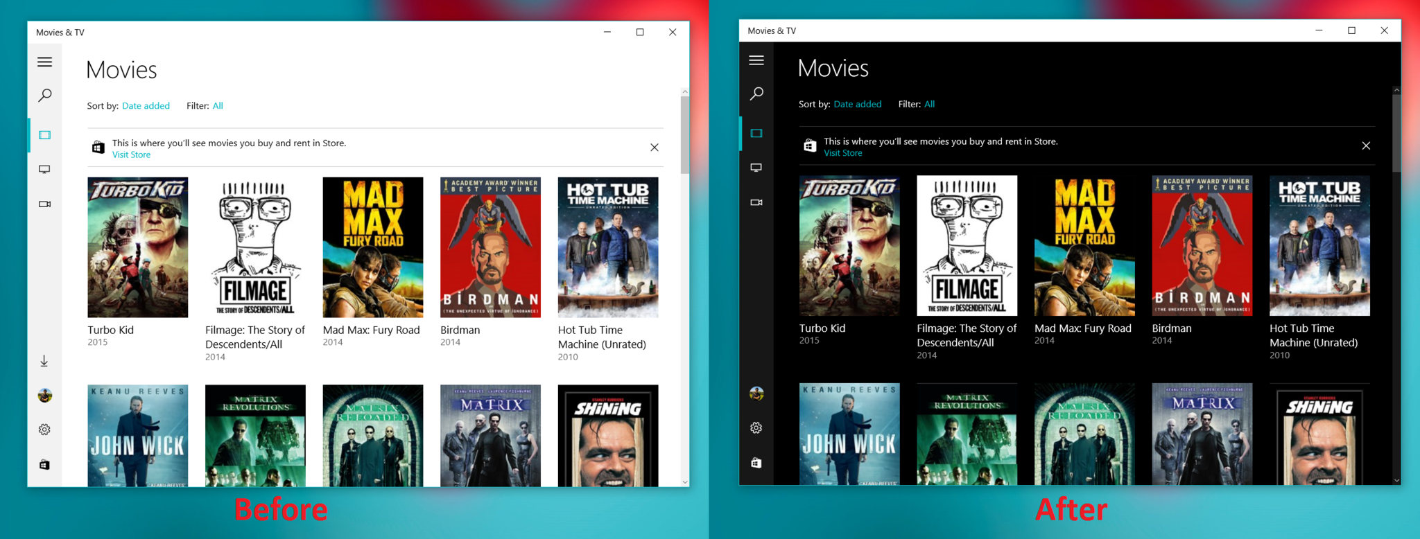 It's important to note that, in order for the changes to take effect, it looks like you need to restart Movies & TV after applying the theme change in the settings menu.
