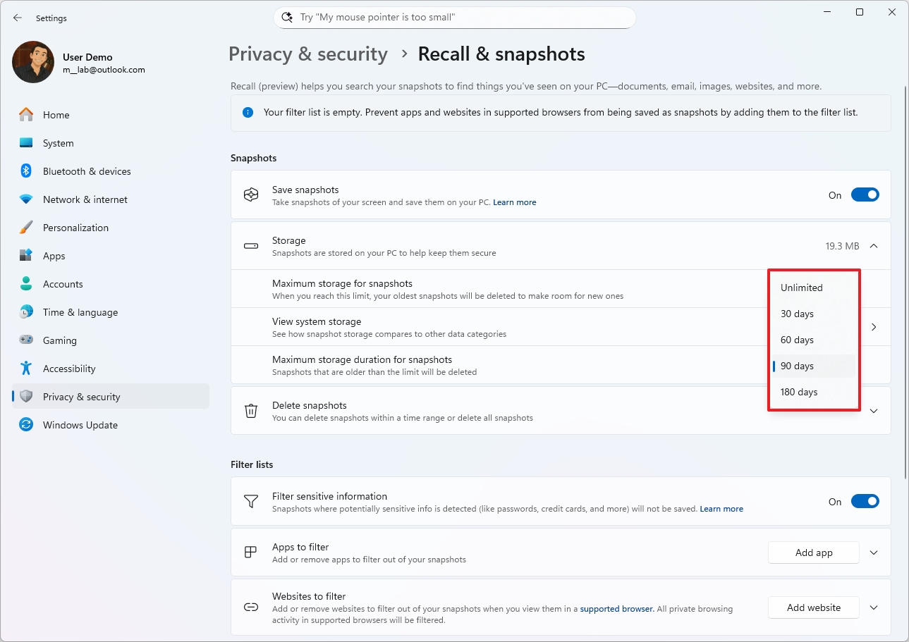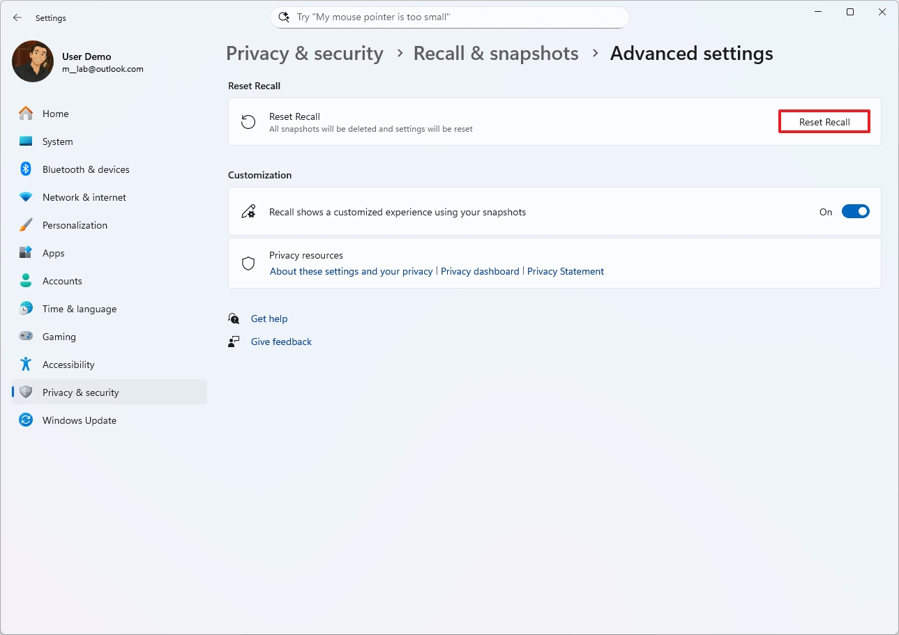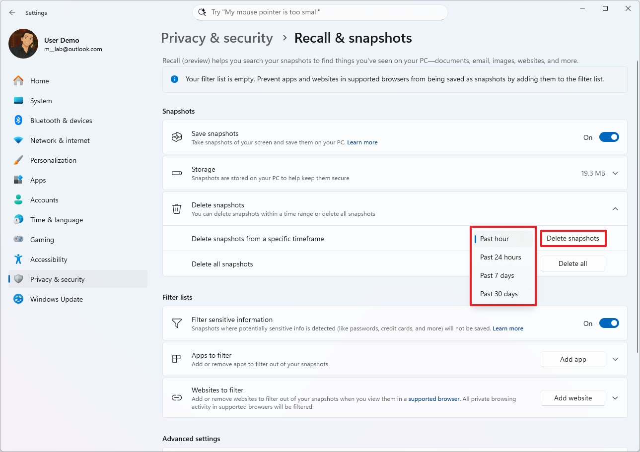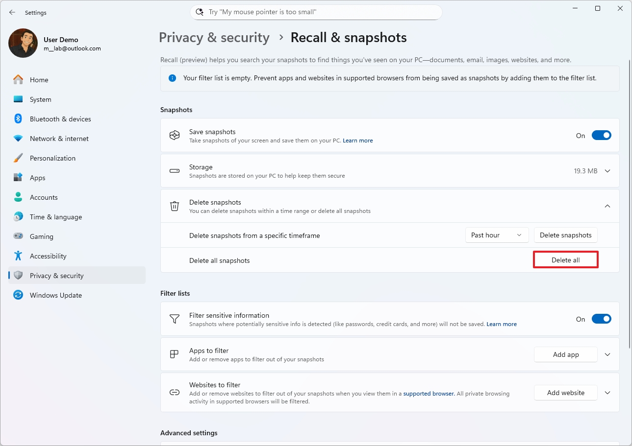 To delete Windows Recall snapshots on Windows 11, use these steps: