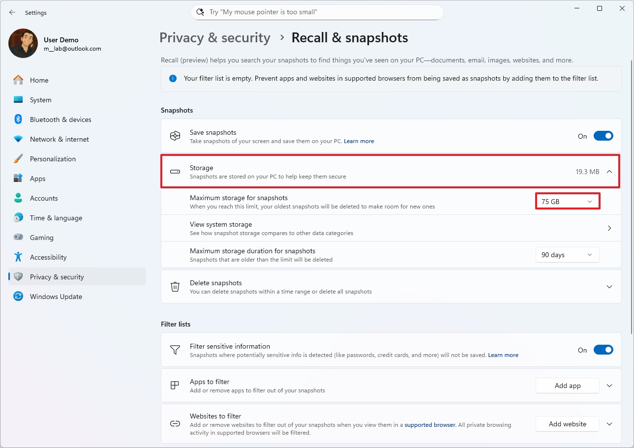 Windows Recall, by default, reserves 25GB of storage on devices with a 256GB SSD, 75GB on devices with a 512GB SSD, and 150GB on devices with a 1TB SSD. However, you can increase or decrease the allocation with the instructions below.