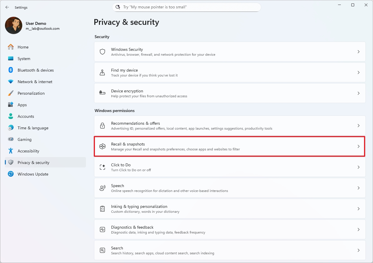 You can also click the "More Recall & snapshots settings" to open the feature page in the Settings app.