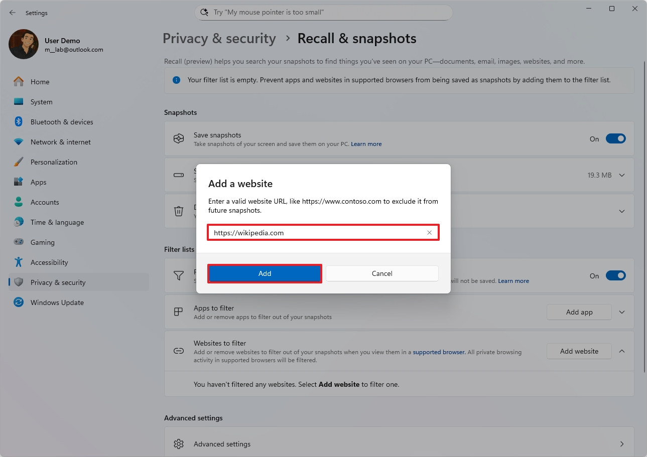 To exclude websites from being recorded by Windows Recall, use these steps: