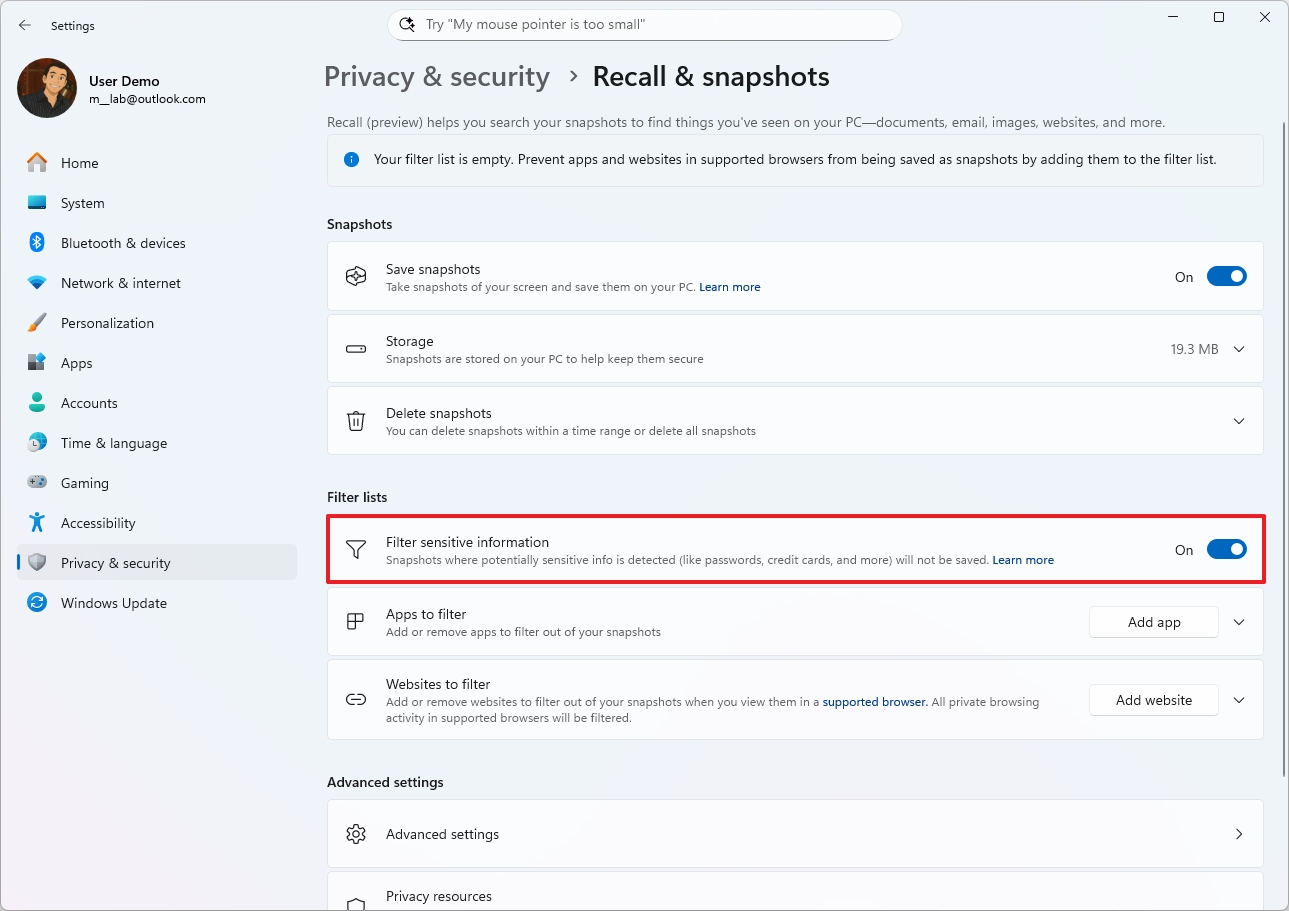 As part of the strategy to improve privacy and security, the AI feature includes a mechanism to detect and filter sensitive information (such as passwords, credit card numbers, etc.). The feature should be turned on by default, but you can always manage the option from the "Recall & snapshots" settings.