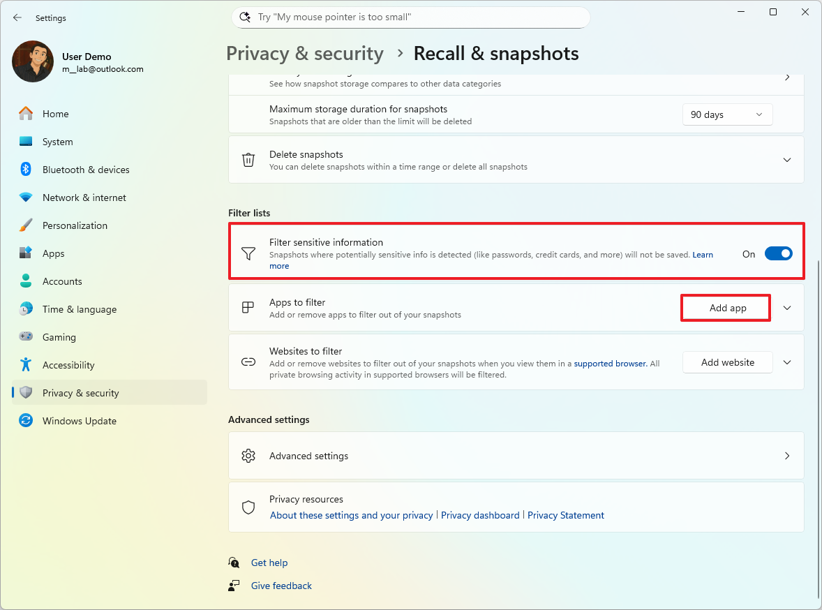 Windows Recall settings, including controls for snapshot storage limits, filtering sensitive information, and excluding specific apps or websites from recording, are located in Settings under "Privacy & security," in the "Recall & snapshots" section.