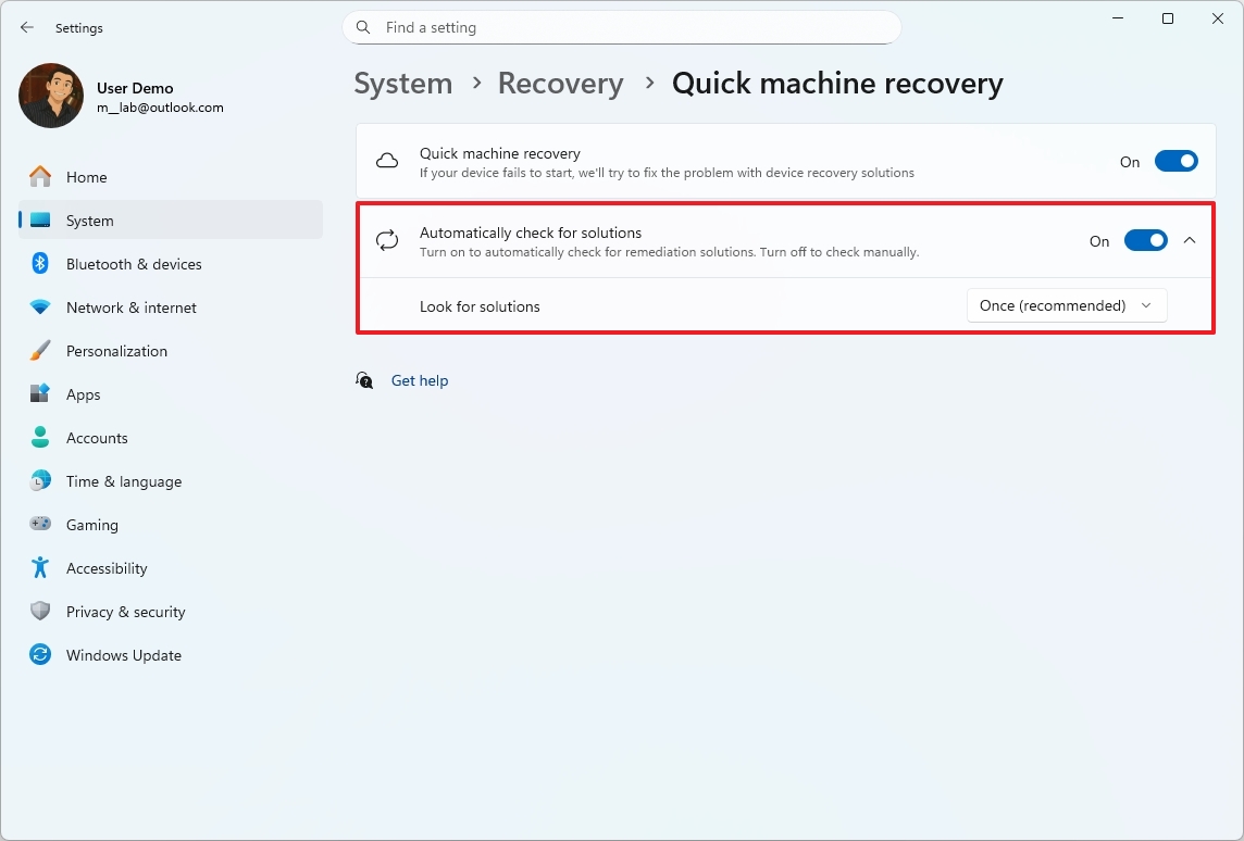The Quick Machine Recovery feature isn't new to this update, but the company is updating how it works. First, the "Continue searching if a solution isn't found" option has been renamed to "Automatically check for solutions."