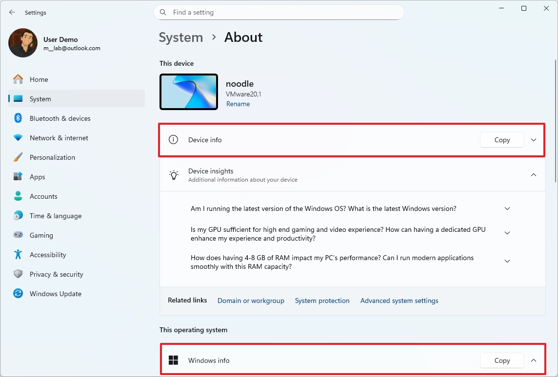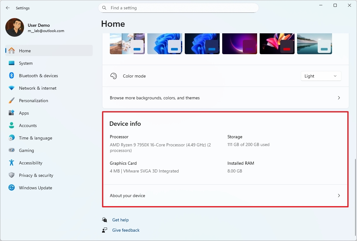 On the Home page of the Settings, after installing this update, you'll find a new "Device info" card that includes key technical specifications about your computer, including processor, storage, memory, and graphics card information.