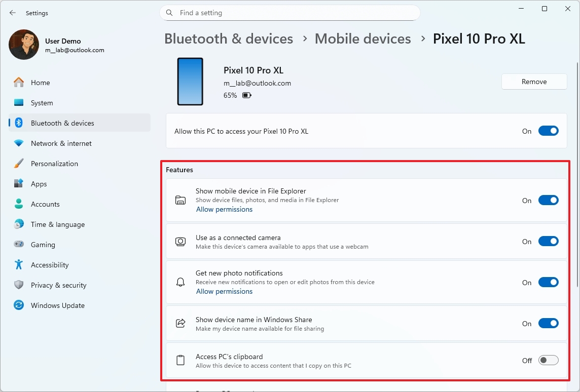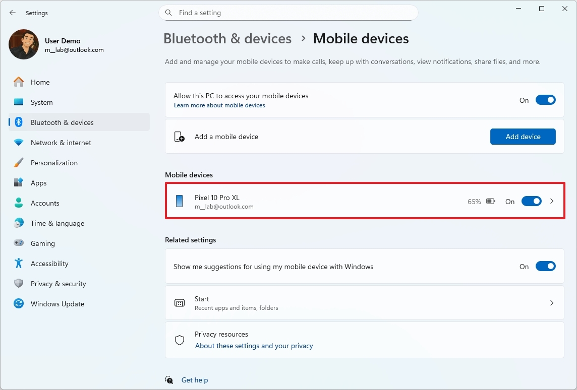 Starting with this update, on Settings > Bluetooth & devices > Mobile devices, you'll find an option to add a new device, and under the "Mobile devices" section, you can access your device's settings.