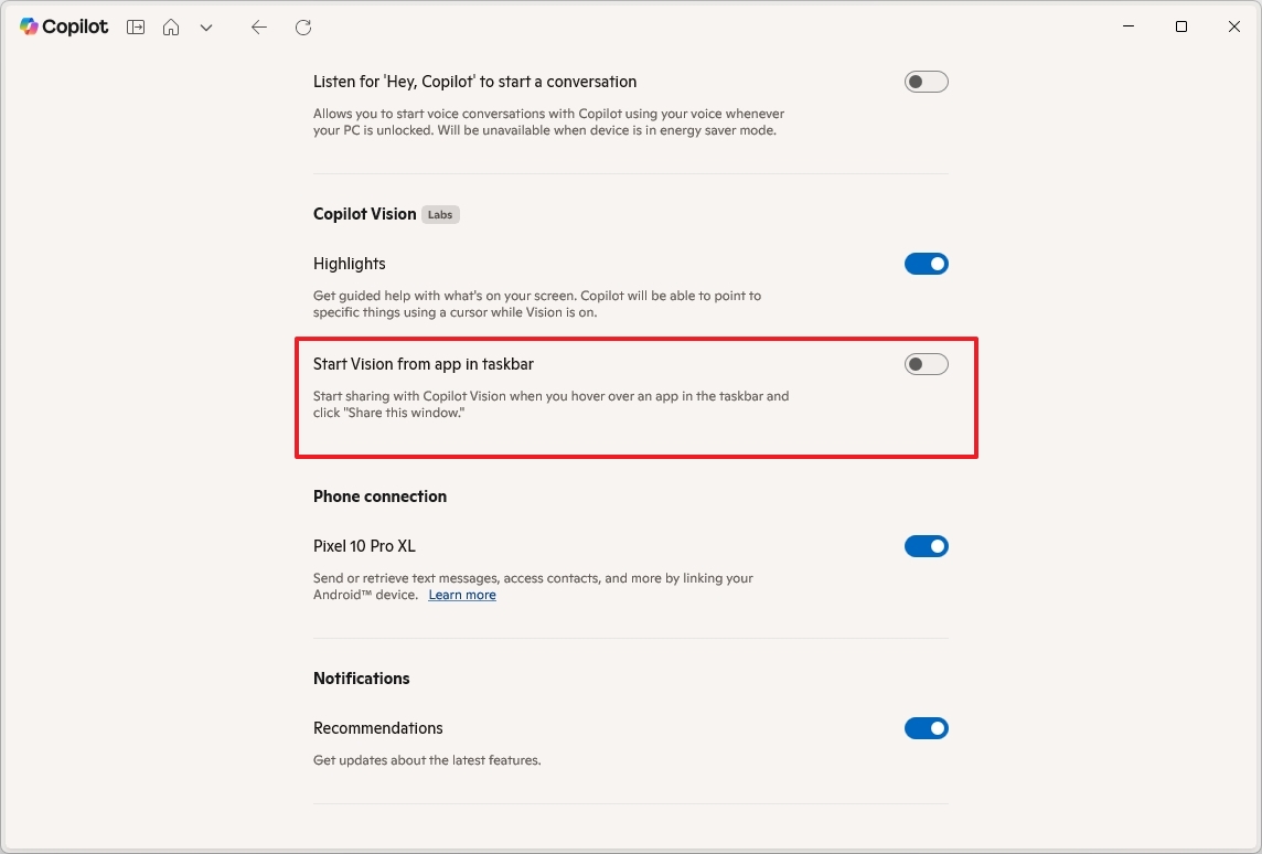 In this release, Microsoft is adding a feature no one asked for. A new "Share with Copilot" option in an app's thumbnail on the Taskbar that allows you to start a conversation with the chatbot using Copilot Vision quickly.