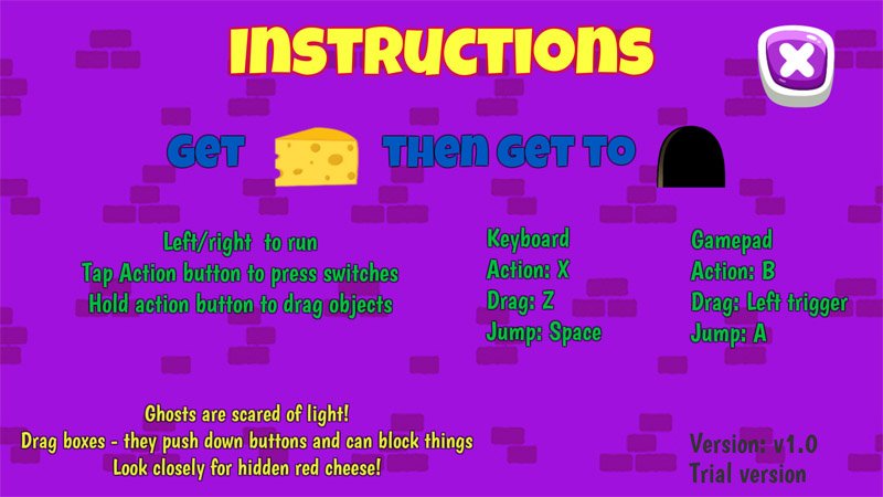 The 63 puzzle levels are spread out across seven houses. Each level has the same goal: grab the cheese and make it back to the safety of your mouse hole. The onscreen controls for Mouse Dreams include directional arrows and action buttons to have Squeaks jump or push/pull items. Additionally, this Windows 10 game has support for keyboard controls for those playing from a non-touchscreen device and support for gamepads.