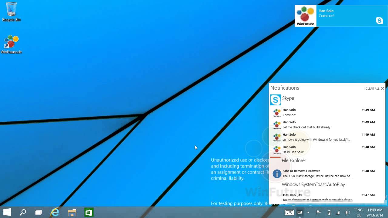The Windows 9 leaks keep coming. Today we have a video of the rumored Notification Center on Windows 9 in action. Yesterday we were treated to two videos showing how multiple desktops would be supported in Windows 9 and how users could disable Live tiles in the Start menu. A new video, again from German site Winfuture.de, shows off a Notification Center running on the desktop in Windows 9.
