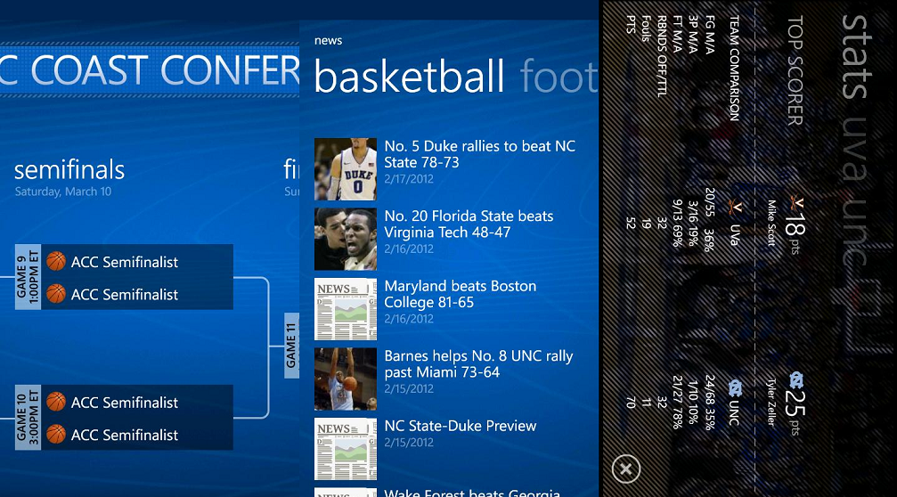 Great news if you're on a Nokia Windows Phone and happen to like sports, specifically basketball this time of year with March Madness afoot. Nokia has evidently teamed up with the Atlantic Coast Conference (ACC) group to make an official app for their phones. The app snuck onto the Marketplace on the 28th and we just found it accidently. As you'd expect from Nokia, the app is top notch and well polished: