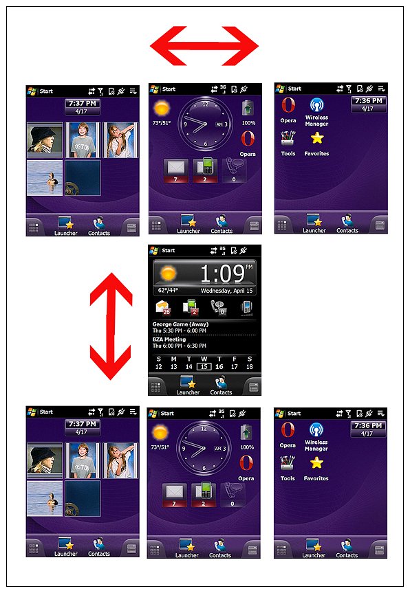 Where the Professional Layout is a single screen, the Lifestyle Layout has two pages to either side of the main screen. These side panels (swipe navigable)can hold widgets ranging from media player to contacts to application launchers. Switching between layouts is as easy as a up/down swipe or you can use the menu tab (lower right corner of the screen) to change layouts. One nice feature of the Lifestyle Layout is that you can use a larger landscape image and as you pan across the three pages, you pan the image. Below is a flow chart of the Mobile Shell 3.0 home pages.