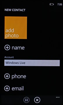 You have other consistent icons throughout Windows Phone 7 include the "X" which means to cancel, a 3.5" floppy disk which means to save, the "+" which means to add or create, and the spyglass represents the search.