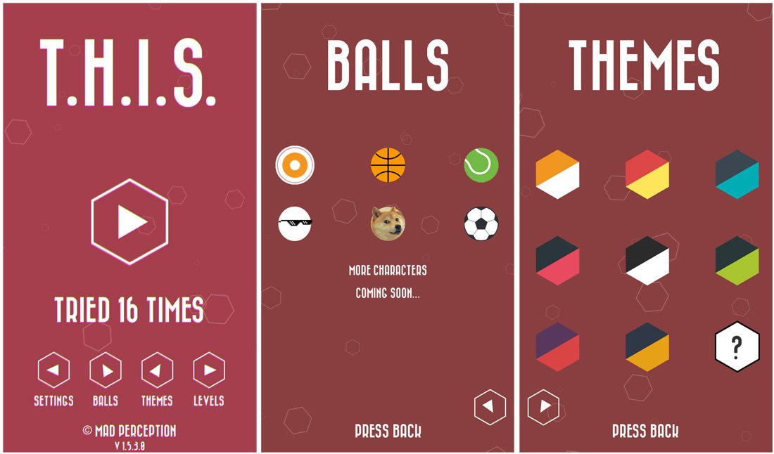 Once you reach the main menu for T.H.I.S. you will find options to jump into gameplay, access the game's settings, choose your ball, choose your color theme and view the gaming levels. T.H.I.S. will resume play at the level you exited the game from or you can replay a level to improve your aim.