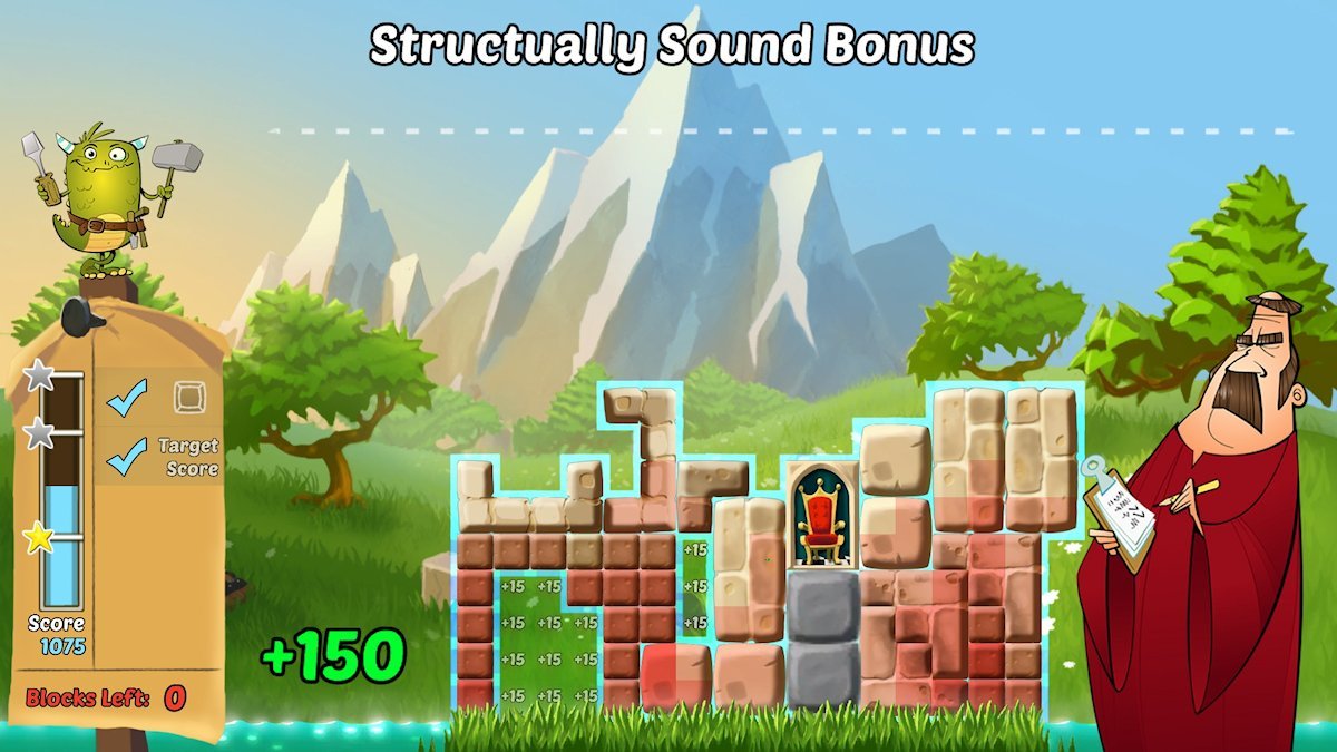 Initially you’ll have only one piece to choose rotate or place on the structure, but eventually you get to choose from several pieces at a time. Only pieces that touch the castle’s throne or connect to touching pieces will contribute to the player’s score.