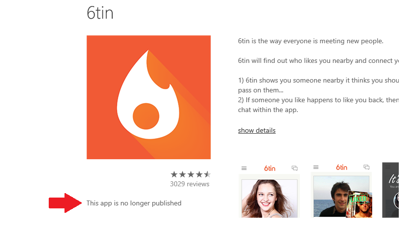 On Monday, June 30th Tinder filed a complaint against 6tin over the usage of 'Tinder' in the app description, triggering Microsoft to pull the app. Within hours, however, Huyn had removed the offending language and 6tin was right back on the Store. Now just 48 hours later, 6tin once again bears the "This app is no longer published" moniker on the Store for Windows Phone.