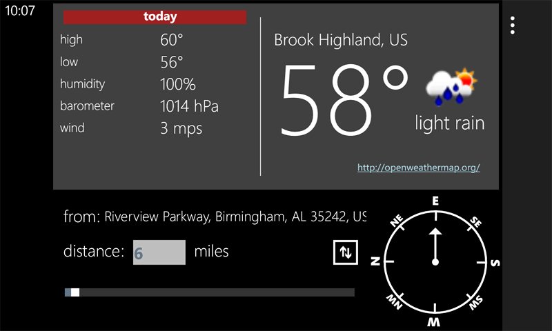 Have you ever wondered what the weather is like on down the road? Weather in the Distance is a unique Windows Phone 8 weather app that will give you the current conditions from points as close as one mile away up to 24,901 miles away.