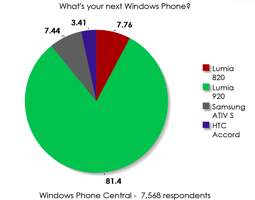 The Nokia Lumia 920 managed to carry away a massive 81.4% of the total sample (or 6,160 individual votes). Next up was the Lumia 820, which came in with 7.76% (587 votes) just edging out the Samsung ATIV S with 7.44% (563 votes). At the bottom was the HTC Accord, a device not yet publicly shown resulting 3.41% total or just 258 votes.