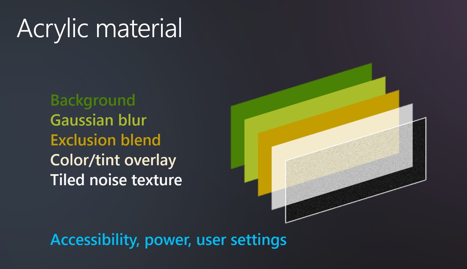 The feature has layers of background, Gaussian blur, exclusion blend, color/tint overlay, and tiled noise texture that you'll usually see on navigation pane and specific parts of the user interface. Additionally, Acrylic Material has built-in policies that allow Windows 10 and applications to provide accessibility, user controls, and power management to optimize battery life on devices.