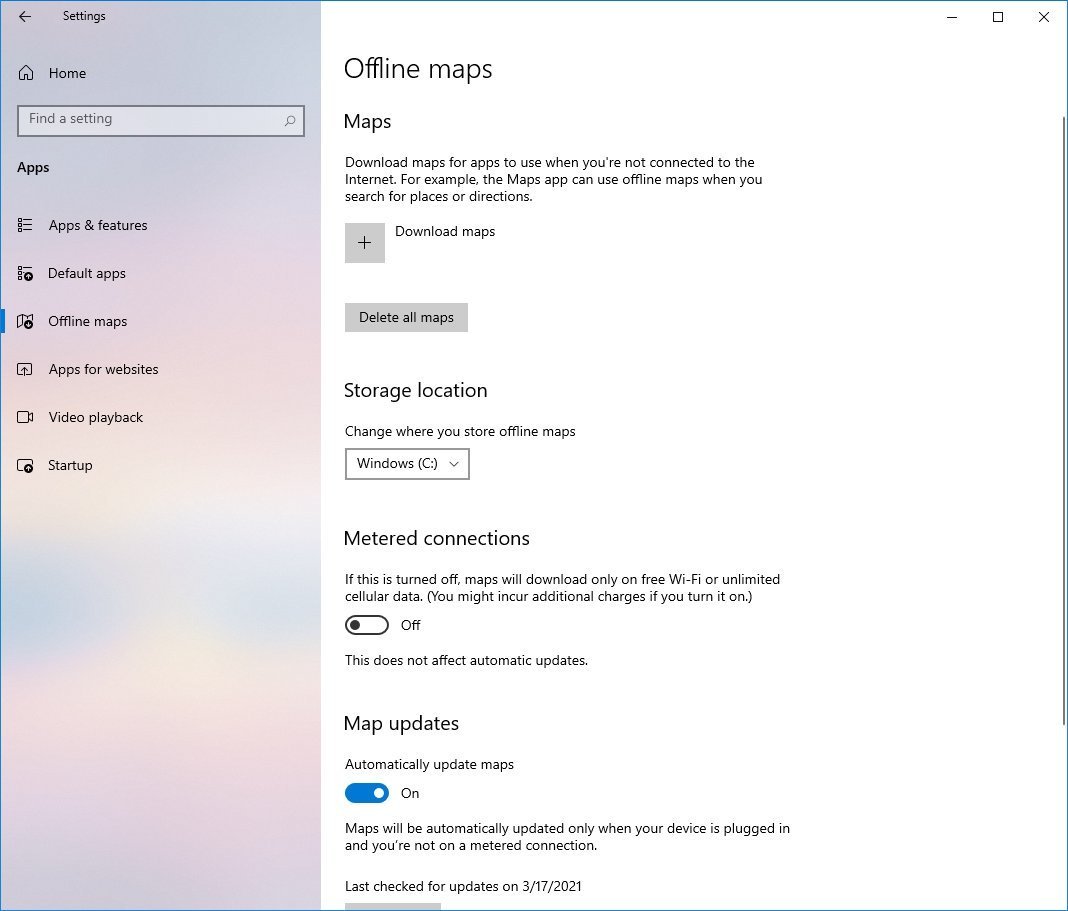 On Settings > Apps, the Offline maps page has been updated with build 20277 to make it clearer to understand.