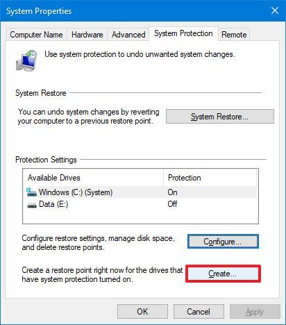 - Search for Create a restore point, and click the top result to open the System Properties app.