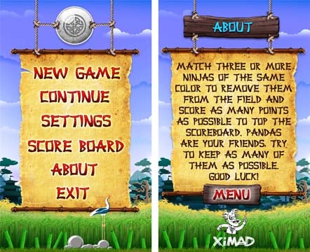 The game screen has the playing field of colored ninjas and pandas that will slowly work its way down the screen. At the bottom of the screen is a link back to the menu, your score and six hash marks. For each move you make that doesn't result in ninjas being removed, you loose a hash mark. Run out of hash marks and the playing field drops a little lower.