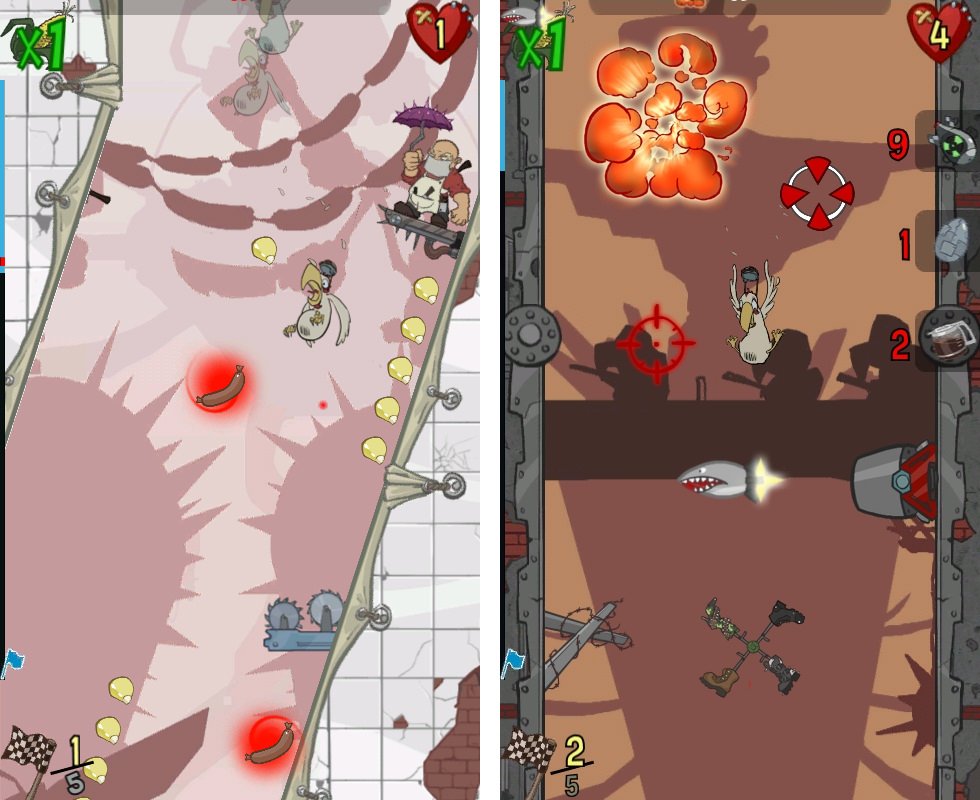 The game’s 61 experiments (levels) are divided up into five labs: Hatchery (tutorial levels), Butchery, Cemetery, Military, and Physics. These labs are more than just different backdrops. Each one has unique powerups, powerdowns, and obstacles, making for a nice bit of variety. New items are usually introduced in their own specific experiment, with creative titles like “Does Chicken like 8-bit?” which involves the Pixelizer item. This teaches players what the items do organically – a good thing because the actual instructions are presented in drawings rather than text (ala Beards & Beaks), presumably to cut down on translation costs.